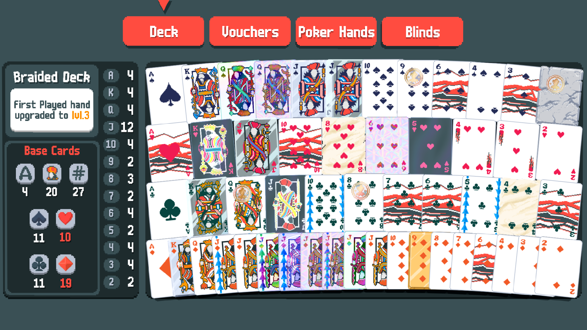Подготовьте арсенал мощных инструментов для победы: различные колоды, джокеров, карты таро, карты планет, спектральные карты и ваучеры. Применяйте их гибко в самых разных сочетания, добиваясь безумных эффектов, с которыми ценность ваших покерных комбинаций улетит в стратосферу благодаря убойной синергии.