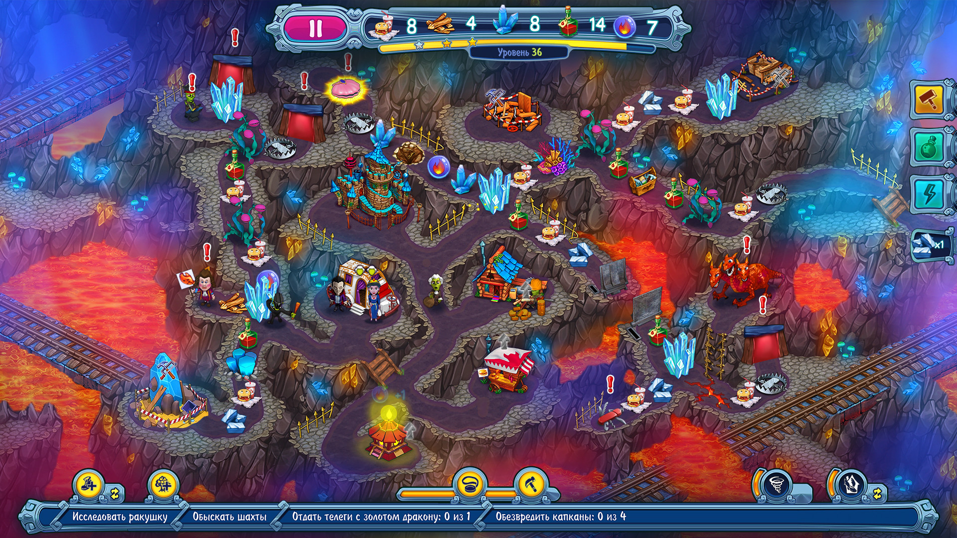 В этой части игры, как и в предыдущих, тоже есть полезные бонусы и улучшения. В процессе прохождения вы сможете находить волшебные амулеты в таинственных ракушках. Они разные: дают ресурсы, увеличивают скорость персонажей, дают повышенную производительность зданиям и всячески помогают проходить уровни. Кроме этого, Дракула может прокачивать магию и навык создания нужных вещей. Зелья, эликсиры, волшебный посох, огнемет и даже сеть, чтобы нейтрализовать огромных и опасных медуз – все это можно сделать самому при наличии нужных ингредиентов, которые находятся на карте уровня или покупаются у торговцев.