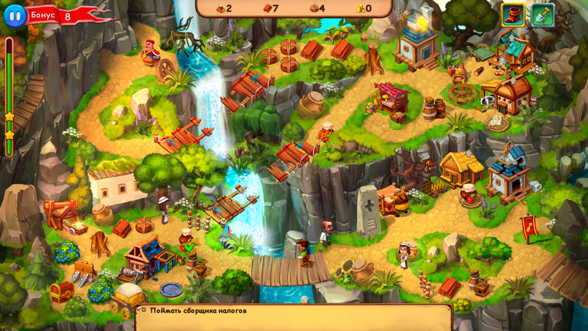 В самой игре 45 уровней основной истории и 9 бонусных, в которых вам будет нужно помочь отцу Туку избавить родной монастырь от сборщика налогов. На всех уровнях вам придется убирать препятствия, ремонтировать здания и мосты и обезвреживать многочисленных врагов. Для этой цели есть несколько ресурсных зданий. Фермы, лавки, лесопилка, прииск, гильдия воров и веревочная мастерская – каждое из зданий поставляет свой ресурс, и их можно улучшать несколько раз. Кроме этого, некоторые местные жители не прочь поторговать с героями, предоставляя различные ресурсы и квестовые предметы за золото.