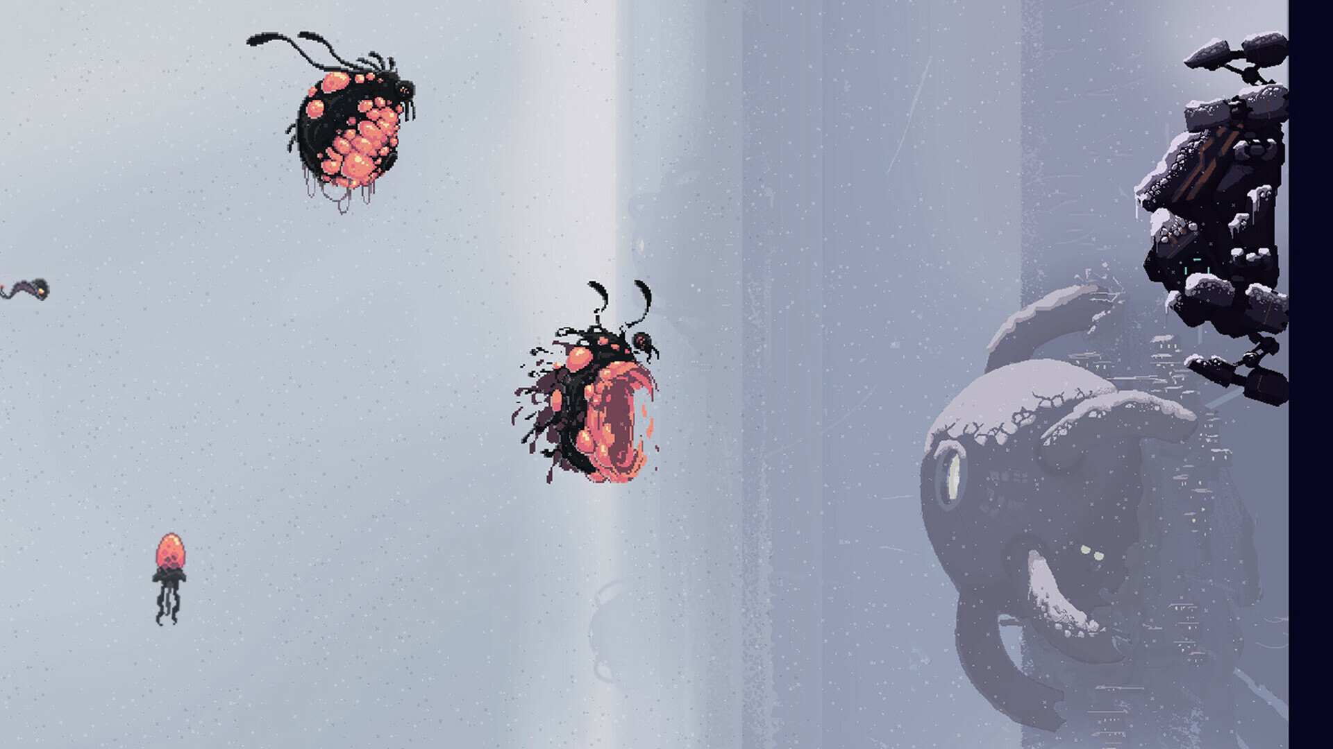 Вгрызайтесь в недра Стены в самых разных местах. Ищите ресурсы и технологии для улучшений, открывайте новые биомы в шахтах, но не забывайте возвращаться к робо-пауку, чтобы успеть к очередной атаке монстров.