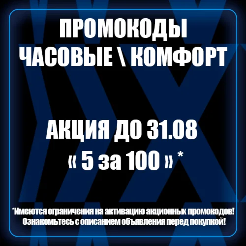 Мгновенная доставка промокодов. Можно купить и активировать сразу несколько ЧАСОВЫХ промокодов - они суммируются! Это не касается премиум или комфорт тарифов!
